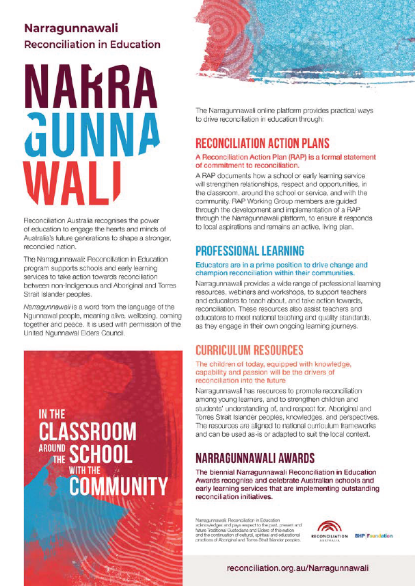 Narragunnawali is a program of Reconciliation Australia. Reconciliation Australia is an independent, national not-for-profit organisation promoting reconciliation by building stronger relationships, respect and trust between the wider Australian community and Aboriginal and Torres Strait Islander peoples.