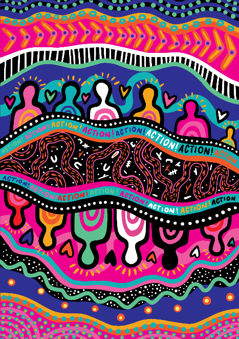 Reconciliation Australia’s Zoe Cassim caught up with the very humble and very talented Jessica Johnson—the artist behind Reconciliation Australia’s NRW 2021 poster Action—to talk all things art, society, and why the next generation are leading the way for present day positive change in the reconciliation space.