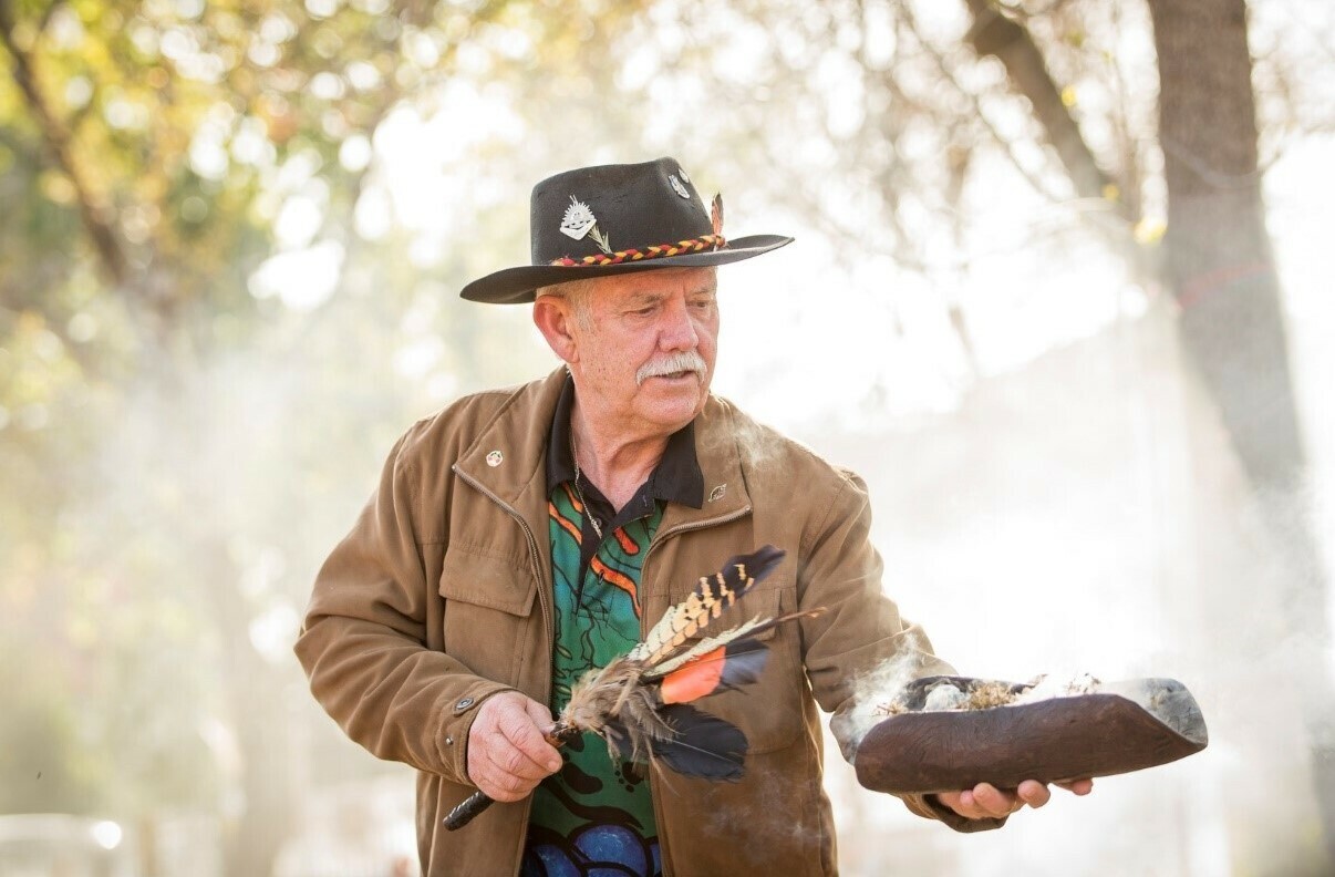 Uncle Ivan performing a Cleansing Ceremony on Country in the Adelaide Hills. Image Supplied by Uncle Ivan.